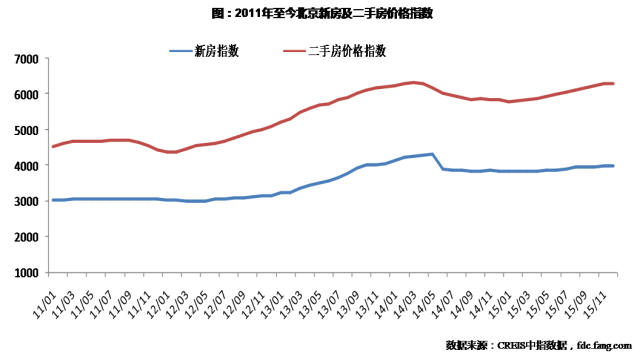 从价格指数来看,新房、二手房两项指标整体以增为主,二手房价格指数增幅高于新房。2015年,北京新房价格指数和二手房价格指数分别从1月份的3849点和5795点涨至12月的3991点和6290点。分月份来看,北京新房价格指数一直保持平稳上行趋势,全年增幅3.69个百分点。二手房价格指数在也呈现全年上行趋势,全年增幅8.54个百分点。二手房价格指数增幅高于新房,主要可归因于2015年央行连续降息,目前银行五年以上贷款基准利率下降到4.9%,贷款成本已下降至历史最低点;与此同时,3月30日政策降低二套房首付款比例为四成,二手房被压制的需求在利好刺激下于2015年全面释放。利息和首付贷降低政策二者叠加,无论对于首置还是置业升级的按揭客户,都有较好地刺激作用。