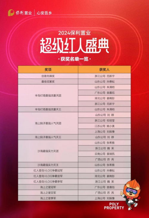 随后红人颁奖将「超级红人盛典」氛围推向了最高潮,全国20位超级红人经过激烈的角逐,诞生了“创意先锋、最佳花絮、最强流量天团、最强流量王、最强实力天团、最强实力王、最强人气天团、最强人气王、流量之星、海上之星”等十多项大奖,见证了保利置业创新营销数字化建设的新成果以及红人风采与高光时刻。
