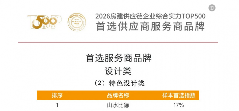 近日,2026中国房地产TOP500研究成果发布会暨房地产发展高峰论坛在北京盛大启幕,《2026房建供应链企业综合实力TOP500首选供应商服务商研究成果报告》同步发布,广州山水比德设计股份有限公司凭借雄厚的综合实力与卓越的行业口碑,荣登首选服务商品牌・特色设计类榜首,其设计创新、技术研发、精准落地与全程服务等核心能力获得房地产开发企业及行业权威机构的高度认可。