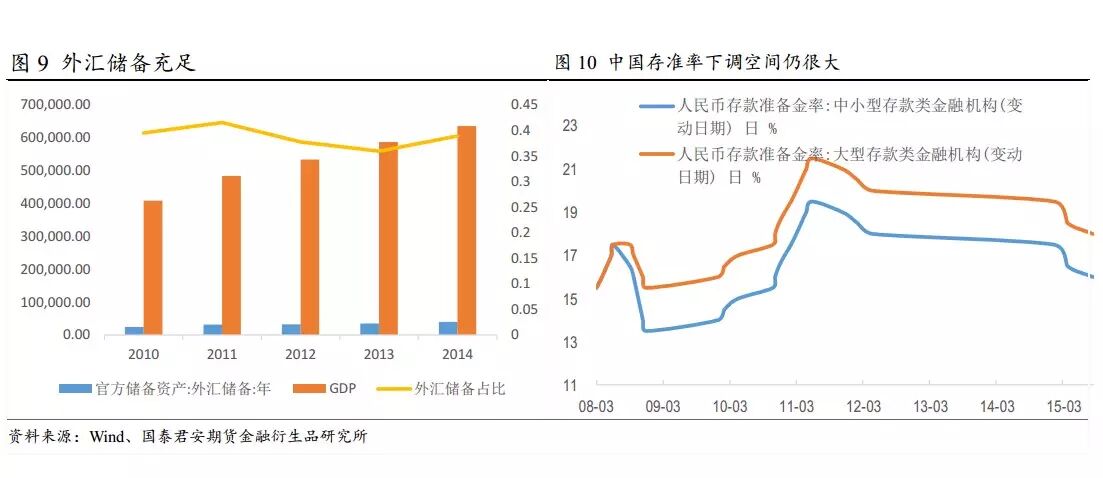图9 外汇储备充足 图10 中国存准率下调空间仍很大