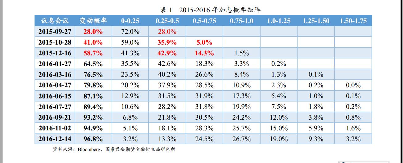 加息节奏:根据截至9月14日的概率信息分析,美联储大概率将在12月份首次加息,其后2016年1月维持0.25-0.5的利率水平不变,至2016年4月份或6月份,美联储第二次加息,概率分别为28.5%和31.9%。