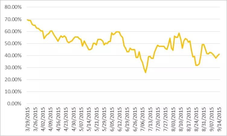 加息幅度:根据不同联邦基金期货合约的横向分析,美联储更可能以0.25的幅度提高联邦基金利率,10月份美国首次加息25个基点的概率为35.9%,12月份首次加息25个基点的概率为42.9%,而2016年1月首次加息25个基点的概率则与12月份基本持平。